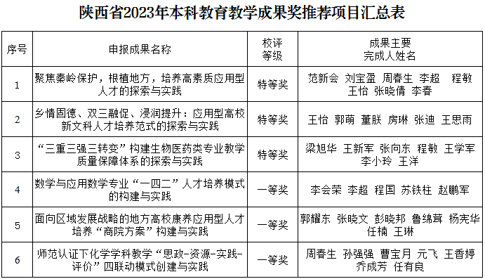 根据《关于开展2023年高等教育教学成果奖评审工作的通知》(陕教函〔2023〕1299号)文件精神,永利官网认真组织开展高等教育教学成果奖申报工作,经各院(部)推荐,校内外专家评审,学校教学工作委员会审定,拟推荐《聚焦秦岭保护,根植地方,培养高素质应用型人才的探索与实践》等6个项目(见下表)申报2023年陕西省高等教育教学成果奖,现予以公示。