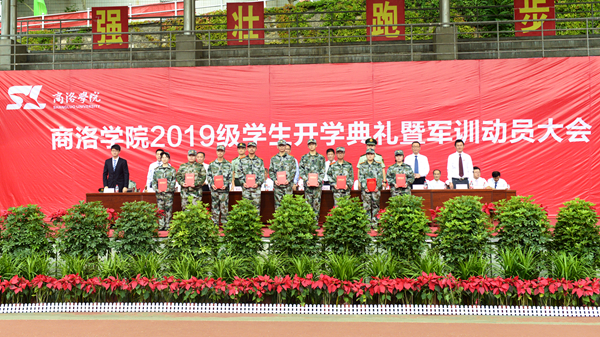 天朗气清、秋风送爽,巍巍学府、德渥群芳。9月5日上午,永利官网2019级学生开学典礼暨军训动员大会在学校体育场隆重举行。党委书记龙治刚、校长范新会、纪委书记王思怀、党委副书记彭虎军,副校长刘宝盈、刘勇,商州区人民武装部部长曹建明上校,武警商洛支队副参谋长、军训团团长吕喆中校,2015届校友、第44届世界技能大赛铜奖获得者、中航工业陕西飞机制造公司职工高雨楠出席大会。各二级学院(部)党政主要负责人、有关职能部门负责人,2019级全体新生及家长代表参加大会。大会由彭虎军主持。