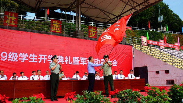 大会伊始,全体起立,奏唱国歌,升国旗。龙治刚为2019级学生军训团授团旗,范新会讲话,刘勇宣读了2019级新生奖学金表彰决定,出席大会的校领导与嘉宾为获奖新生颁奖。