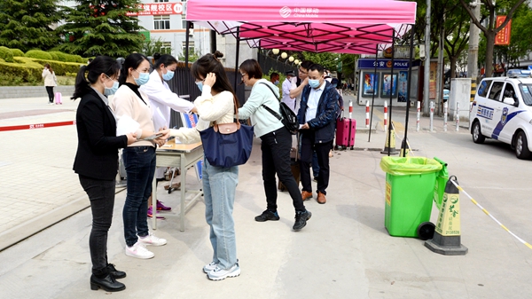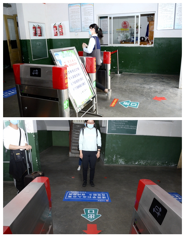 随着龙治刚“演练开始”一声令下,紧张有序的演练正式拉开帷幕,几十余名“学生”在学校大门口外保持1.5米间隔依次进入消毒通道,卸下旧口罩投弃到专用垃圾箱后佩戴工作人员配发的一次性医用口罩,经工作人员查验有效证件后进入校门口自动测温门,进行第一次体温检测。体温检测正常的学生按照指示线到一号教学楼前的各学院接待点接受二次体温检测、扫描验证健康二维码、填写健康承诺书。