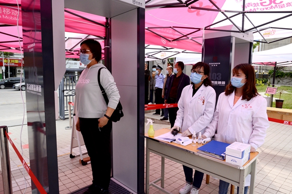 “嘀嘀嘀”,测温门报警声突然响起,发现一名学生体温异常。测温工作人员立即挡停当事学生原地等待,要求后面学生退后改道通行,临时封闭该通道并立即报告现场值班医护人员。医务人员赶赴现场对学生进行防护指导,引导异常学生到距离最近的临时隔离点,对学生进行手部消毒、核实体温、询问流行病学史并做好记录,消毒人员对该生通过的路线及临时隔离点进行终末消毒……