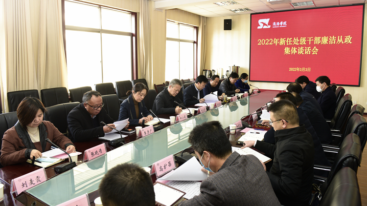 3月3日上午,永利官网召开2022年新任处级干部廉洁从政集体谈话会。校党委书记张志昌出席会议并讲话,党委副书记彭虎军主持会议。纪委、组织部负责人及21名新任处级干部参加会议。