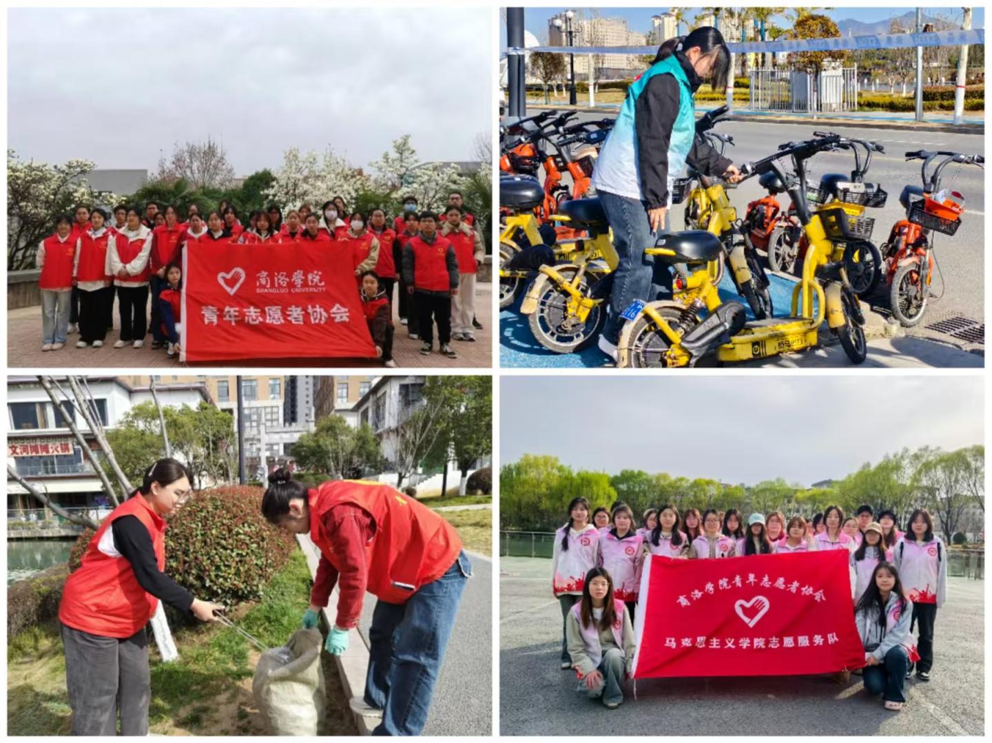 守护生态绿意,共筑绿色家园。校青年志愿者协会组织志愿者清理丹江公园垃圾,以点滴汗水守护青山绿水,倡导环境保护。生物学院开展“共享出行更文明”志愿活动,呼吁绿色出行,并以实际行动解决共享电动车带来的交通堵塞问题。马克思主义学院在莲湖公园开展“春意盎然,青春同行”志愿活动,传递行走的青春正能量。