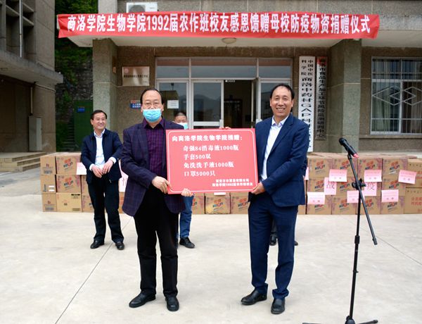 4月22日,永利官网生物学院92届校友向母校捐赠价值10万元的防疫物资。校长范新会,副校长王新军,校友代表、洛南县委副书记马建琦及西安方尔贸易有限公司总经理林建军出席在学校举行的捐赠仪式。院长办公室、生物学院负责人,教师代表,生物学院农作班92届部分校友参加捐赠仪式。