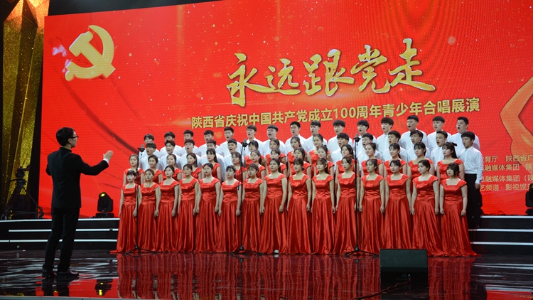 陕西省庆祝中国共产党成立100周年“永远跟党走”青少年合唱展演活动,由陕西省教育厅、陕西省广播电视局、陕西广电融媒体集团联合主办,旨在坚持以社会主义核心价值观为引领,坚持根植中华优秀传统文化深厚土壤,坚持以美育人、以美化人、以美培元,引导学生树立共产主义远大理想和中国特色社会主义共同理想,增强学生的中国特色社会主义道路自信、理论自信、制度自信、文化自信,立志肩负起民族复兴的时代重任,培养德智体美劳全面发展的社会主义建设者和接班人,以优异成绩向中国共产党成立100周年献礼。活动共收到全省120余所大、中、小学推荐报送的参演作品,其中高等学校约60所,11所高校获得了陕西广播电视台现场录制及展演,并将在陕西广电融媒体集团(陕西广播电视台)公共文艺频道进行播出。
