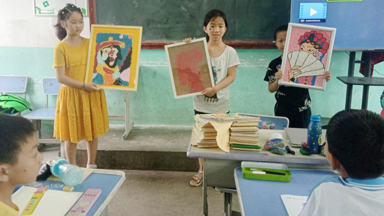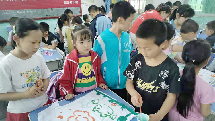活动中,师生为该校留守儿童赠送了图画本、铅笔、橡皮等绘画用品。向小朋友们展示了校艺术学院学生制作的泥塑、石头画、剪纸拼画、电脑绘画等美术作品,拓展了小朋友们的审美视野,增强了大家的逻辑思维与形象思维能力,激发了大家热爱美、发现美、追求美的热情。师生还进行了“T恤衫彩绘”现场学创实践,用美术实践与T恤衫绘画相结合的教学方式,鼓励和引导小朋友们尝试多样思维和多元表现,进一步增强了大家的实践创作能力。在永利官网师生一对一、手把手的耐心讲解与悉心指导下,每个小朋友都独立完成了精美的美术作品。