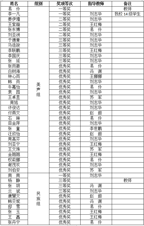 大赛设美声组、民族组、幼儿组、少儿组、少年组5个组别,共146名选手参赛,包含永利官网音乐专业师生和各区县声乐人才。经过激烈角逐,永利官网艺术学院教师易伶、学生南南分别获得美声组和民族组一等奖,学生姜伊璠、王紫璇、张东博,刘亚洲获得美声组二等奖,教师杨静、学生于德青等8人获得三等奖,27人获得优秀奖,8名教师获优秀指导教师奖。大赛还推选美声组前5名和民族组前5名参加陕西省决赛,永利官网7位师生位列其中。
