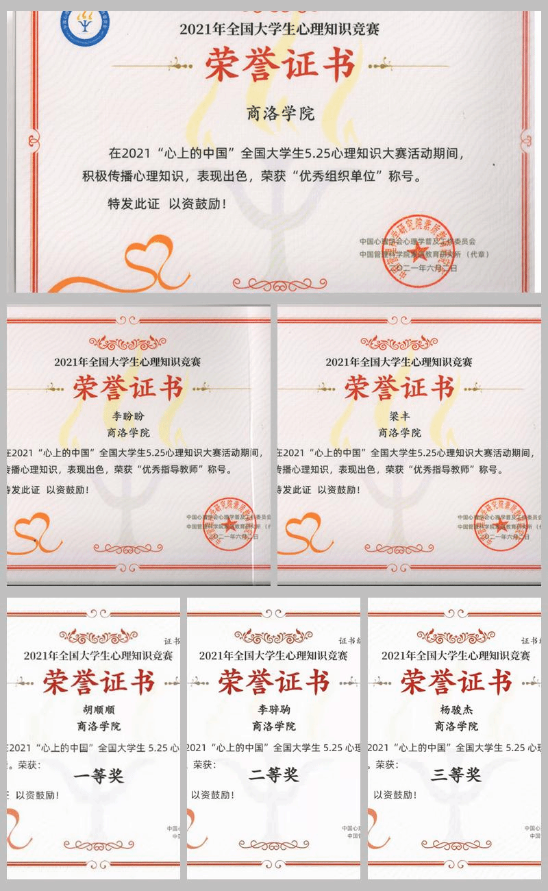 近日,2021“心上的中国”全国大学生5·25心理知识大赛活动圆满落幕,永利官网健康管理学院心理学专业学生参加比赛,并获得一等奖13项,二等奖3项,三等奖4项,学校荣获“优秀组织单位”,健康管理学院教师梁丰、李盼盼获得“优秀指导教师”。