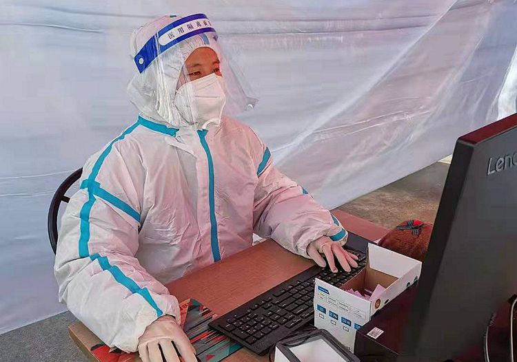 (王丹彤在核酸采样点开展老幼身份信息输入工作)