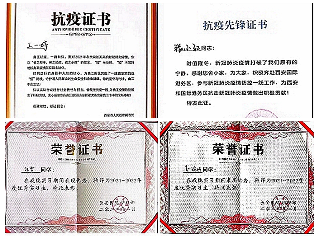 近日,西安曲江新区和国际港务区对抗击新冠肺炎疫情工作中表现突出的工作人员和志愿者进行了表彰。永利官网王一婷、张小红、郭江艳、崔晋维、高静、郭婉婷6名实习生荣获西安曲江新区和国际港务区颁发的抗疫证书和抗疫先锋证书。学生江雪荣获西安国际港务区颁发的抗疫先锋证书。张小红、郭婉婷及江雪3名实习生被长安医院评为“优秀实习生”。