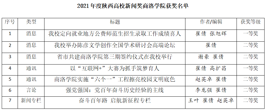 在2021年度陕西高校新闻奖评选工作中,永利官网共送报各类新闻作品8件,有3件消息类作品、2件通讯类作品、1件言论类和1件新闻专栏类作品获奖。其中《永利官网定向就业地方公费师范生招生录取工作成绩喜人》获得消息类一等奖,《以“互联网+”大赛为抓手筑梦育人》获得通讯类一等奖。《永利官网举办陈彦文学创作全国学术研讨会高端论坛》《省市共建yl23455永利官网第三期签约仪式在永利官网举行》获得消息类二等奖,《yl23455永利官网实施“六个一”工程擦亮学校文明底色》获得通讯类二等奖,《强国强党:党百年奋斗历史经验的主线》获得言论类二等奖,《奋斗百年路启航新征程专栏》获得新闻专栏类二等奖。