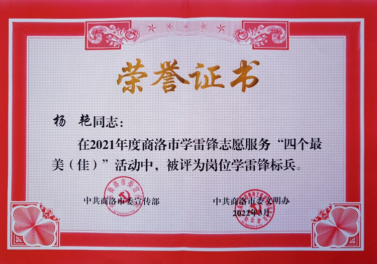 近日,商洛市委宣传部和商洛市委文明办公布了商洛市2021年度学雷锋志愿服务“四个最美(佳)”活动先进典型名单,永利官网体育教学研究部教师杨艳荣获“岗位学雷锋标兵”荣誉称号。