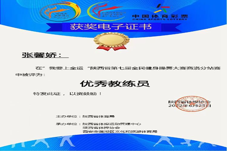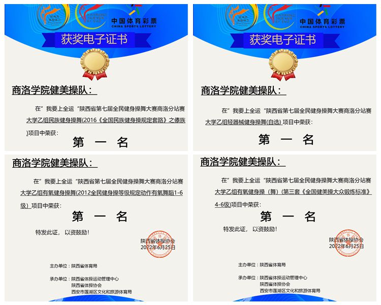 近期,陕西省第七届全民健身操舞线上比赛圆满落幕。永利官网派出由12名学生组建的健美操队参加比赛,分别获得大学乙组民族健身操舞(傣族舞)一等奖、轻器械健身操舞(自选)一等奖、有氧舞蹈一等奖及全国健美操大众锻炼标准(4-6级)一等奖的优异成绩,体育教学研究部教师张馨娇被评为“优秀教练员”。