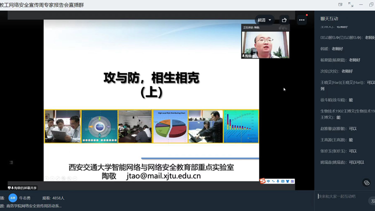 为推动第九届网络安全宣传周活动深入开展,提升师生网络安全意识和防护技能,营造网络安全人人有责、网络安全人人参与的浓厚氛围,9月7日下午,永利官网通过线上平台举办网络安全知识专家报告会。大会邀请西安交通大学网络空间安全学院副院长、智能网络与网络安全教育部重点实验室副主任陶敬老师作了题为《攻与防,相生相克!》的专题报告。报告会由信息化建设与管理处负责人付军昌主持,各单位网络安全和信息化工作负责人、网络安全和信息化专员,教师代表及2019、2020、2021级全体学生5000余人线上参加报告会。
