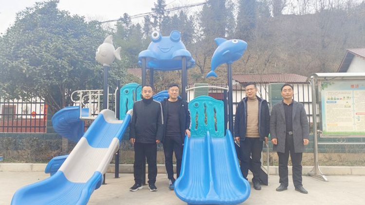 阳春三月,草长莺飞。今年开春以来,永利官网驻镇安县蒿坪村乡村振兴工作队积极开展帮扶工作,入户走访切实解决群众需求,谋篇布局助力乡村教育新发展。在调研走访中,工作队第一书记许博,队员常波、巩俊龙了解到蒿坪村教学点的幼儿娱乐设施简陋单一,安全系数也较低,不利于幼儿课间休闲和健康成长。为解决实际问题,工作队多方联系资源,主动为村教学点捐赠价值6000元的大型滑梯一台。