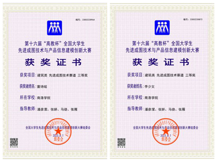 近日,第十六届“高教杯”全国大学生先进成图技术与产品信息建模创新大赛全国总决赛在重庆举行,永利官网建工学院城乡规划2101班雷诗瑶、2001班李少文在建筑类先进成图技术赛道获三等奖2项。