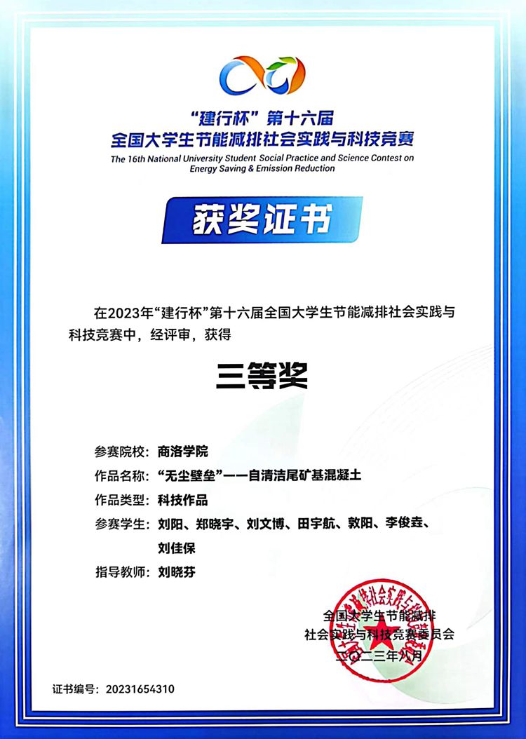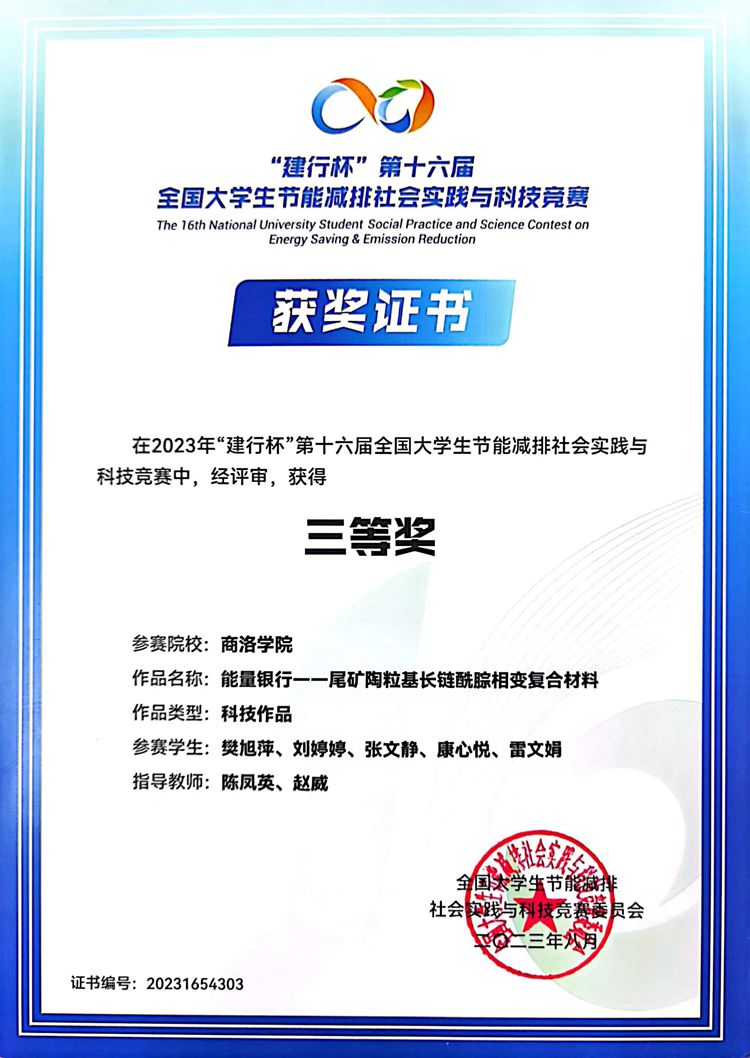 近日,由教育部高等学校能源动力类专业教学指导委员会指导,全国大学生节能减排社会实践与科技竞赛委员会主办的“建行杯”第十六届全国大学生节能减排社会实践与科技竞赛决赛在东南大学举行。经过激烈角逐,化材学院刘晓芬博士指导完成的作品《“无尘壁垒”——自清洁尾矿基混凝土》、陈凤英教授、赵威副教授联合指导完成的作品《能量银行——尾矿陶粒基长链酰腙相变复合材料》从全国近7000件作品中脱颖而出,荣获国赛三等奖。