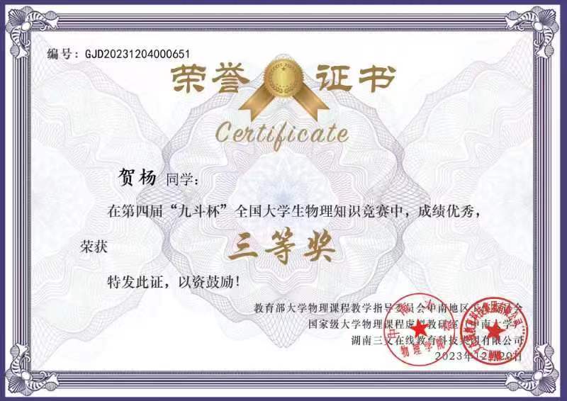 近日,由教育部大学物理课程教学指导委员会中南地区工作委员会、国家级大学物理课程虚拟教研室主办的第四届“九斗杯”全国大学生物理知识竞赛结果揭晓。永利官网电信学院学生石宏江、闫露、杨悦、贺杨在决赛中喜获全国三等奖。