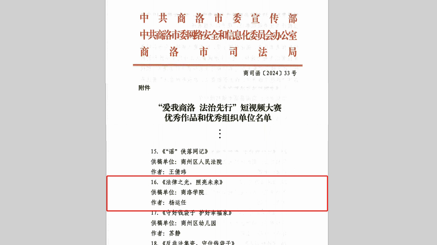 “爱我商洛 法制先行”短视频大赛由商洛市委宣传部、市委网信办、市司法局联合举办,大赛共征集到全市各单位报送的107部短视频作品,经过对作品体裁、主题、内容、画质、声音等要素的综合评审,最终评选出30部优秀作品,永利官网选报的《法律之光 照亮未来》短视频作品名列其中。
