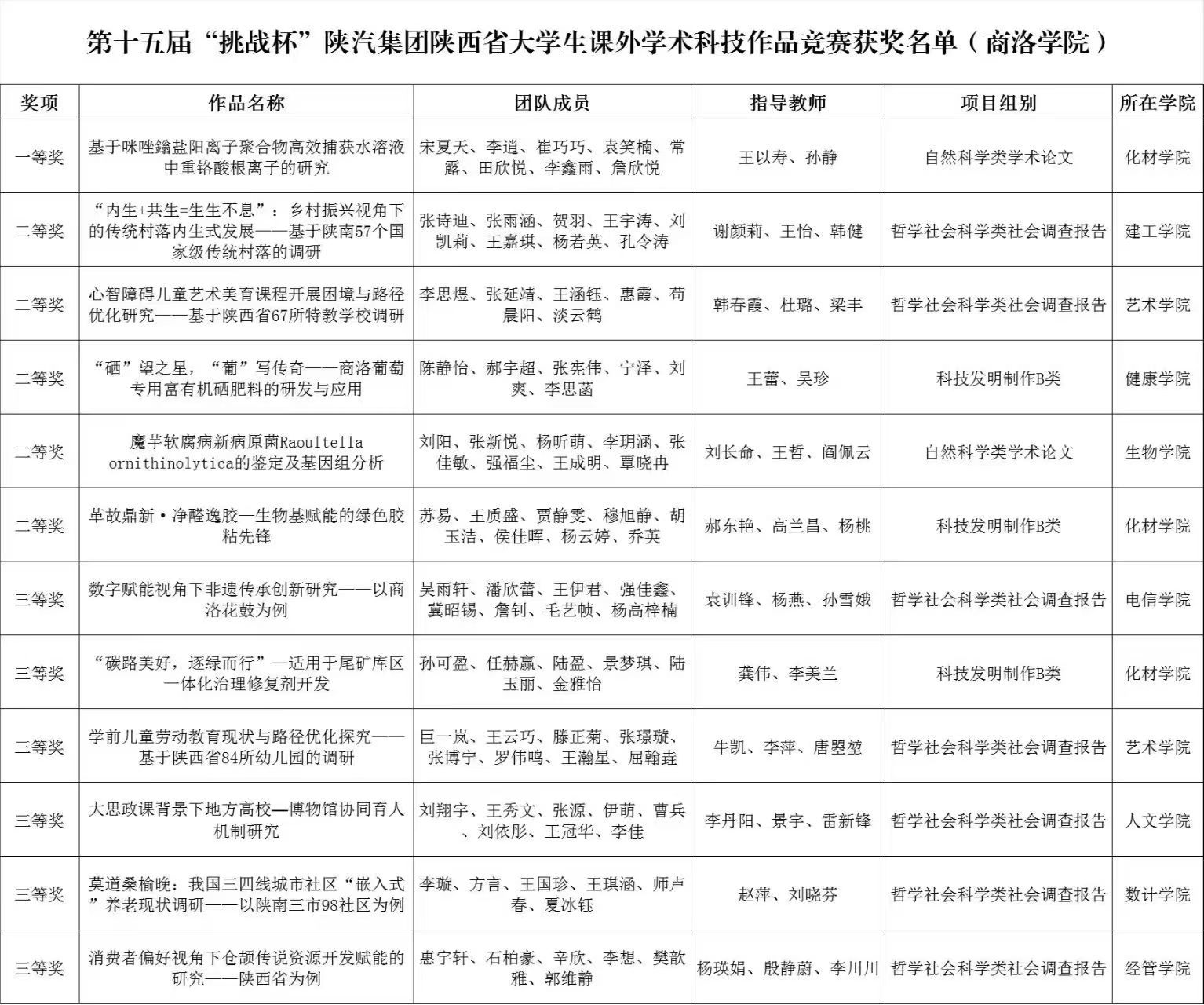 5月24日,第十五届“挑战杯”陕西省大学生课外学术科技作品竞赛圆满落幕。永利官网推荐参与省赛的13件作品中有12件获奖,其中一等奖1项、二等奖5项、三等奖6项,获奖项目总数取得新的突破。