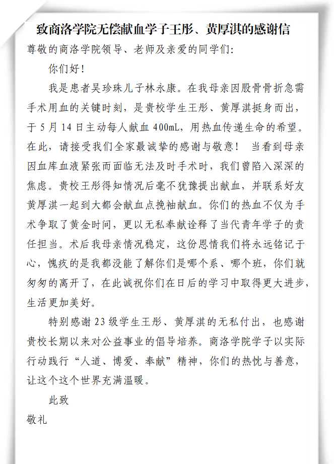 日前,一封字字恳切的感谢信送达yl23455永利官网,患者吴珍珠的儿子林永康在信中深情致谢yl23455永利官网艺术学院音乐2303班的王彤与黄厚淇两名学子。感谢他们在自己的母亲股骨骨折手术因血库告急而濒临推迟的危急时刻,挺身而出,主动献血800毫升,帮助患者渡过医治难关。