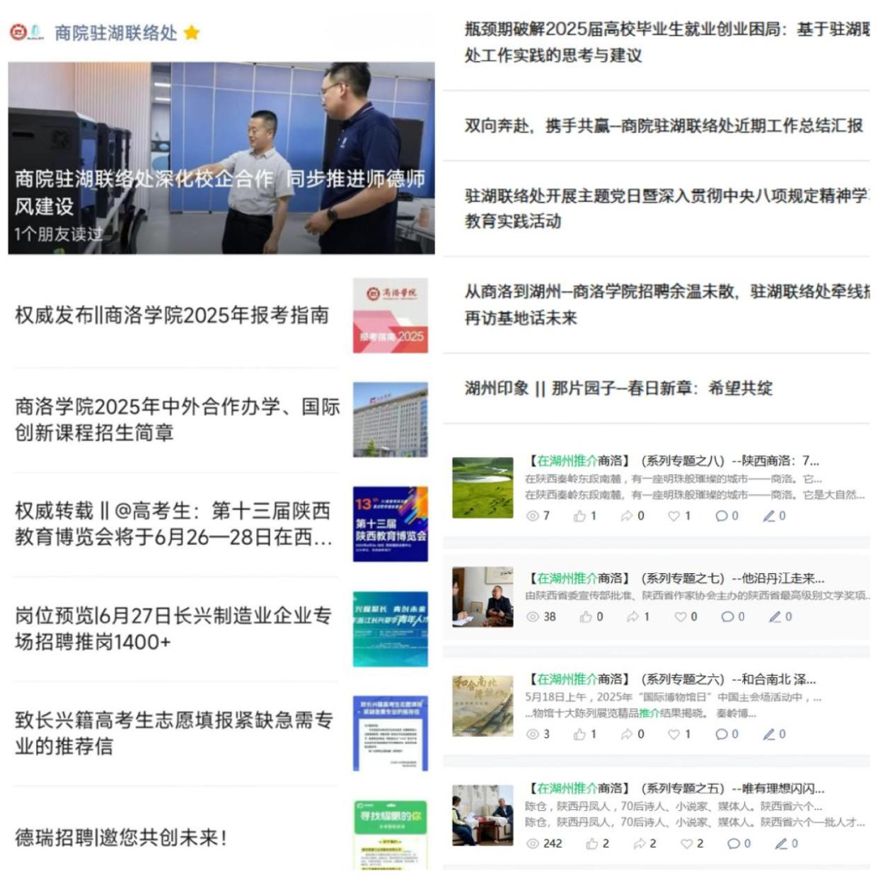 讲好商院故事,提升社会影响力。通过“商院驻湖联络处”公众号发布联络处工作动态、阶段性工作总结、学校重点新闻、就业政策解读、企业招聘动态等内容260余篇。其中,发布“在湖州推介商洛”系列内容8篇,发表《yl23455永利官网驻湖州就业人才工作联络处积极开展系列活动》《双向奔赴,携手共赢--商院驻湖联络处近期工作总结汇报》《湖州·yl23455永利官网:共谱双向奔赴之华章》等总结综述性文章6篇,构筑起“信息集散地”与“校地交流窗口”的双向枢纽,既主动向外展示学校形象、联络处成果与商洛特色,亦向内传递湖州产业生态、就业趋势与政策红利。