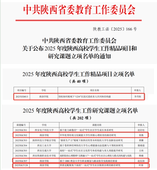 近日,陕西省委教育工委发布《关于公布2025年度陕西高校学生工作精品项目和研究课题立项名单的通知》,经个人申报、学校推荐、资格审核、专家评选、结果公示、工委研究等程序,永利官网申报的1项精品项目和3项研究课题全部获批,在全省40项精品项目和202项研究课题中排名位居前列,创下永利官网近年来学生工作项目、课题省级立项的最好成绩。