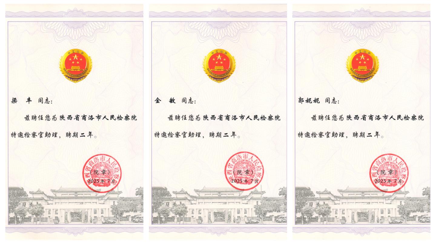 近日,商洛市人民检察院公布了兼任检察官助理聘任名单,永利官网教师梁丰、郭妮妮、金敏被聘为商洛市人民检察院特邀检察官助理,聘期2年。