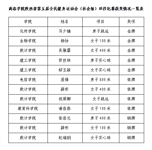 9月14日,陕西省第五届全民健身运动会(社会组)田径比赛在山阳县落幕,在巅峰组比赛中,永利官网教师桑国鹏获男子实心球第一名、王品获男子跳远第二名、闫苏荣获女子100米第二名,牛洋洋获女子实心球第二名。由永利官网教师王品带领的学生田径队员荣获金奖5项、银奖4项、铜奖3项,充分展现了学校体育育人的成果和学子们良好的精神风貌。