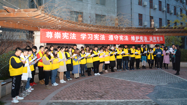12月4日是我国第五个国家宪法日暨第18个全国法制宣传日。今天早晨,永利官网在一号教学楼前举行升国旗仪式并在莘子苑举行宪法晨读活动。校党委宣传部、团委负责人及相关人员,青马班学员、健康管理学院学生代表参加活动。