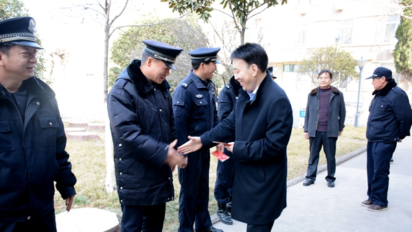 爆竹声声辞旧岁,春风送暖迎新年。2月4日,在农历除夕,副校长魏书堂、党委副书记彭虎军深入永利官网北新街校区和丹江校区,看望慰问寒假和春节期间仍然坚守在工作一线的教职员工,为他们送上节日问候和新春祝福。党委办公室·院长办公室、保卫处、后勤保障处、丹江校区管理处等相关职能部门负责人参加了慰问活动。
