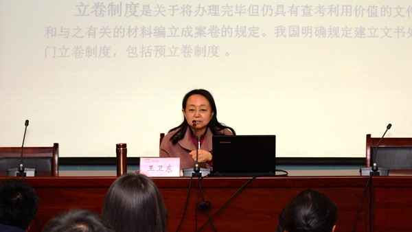 王卫东以《文件材料的立卷归档及其方法》为题,结合自身档案工作经历,全面系统地为永利官网档案工作人员阐释了立卷归档工作的重要性及文书立卷人员职责,详细介绍了立卷归档工作的方法、流程和操作实务。她还现场为永利官网档案管理工作人员答疑解惑,把长安大学的档案管理理念和她个人的工作经验分享给与会人员。她的报告通俗易懂、生动具体,为永利官网科学规范地做好档案材料收集、立卷、分类、组卷、编目、移交归档等具体工作提供了有益指导。