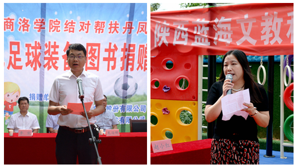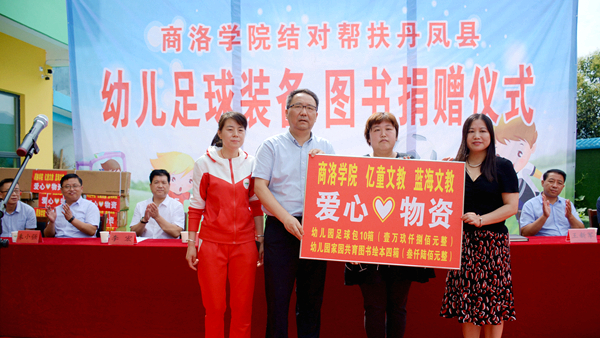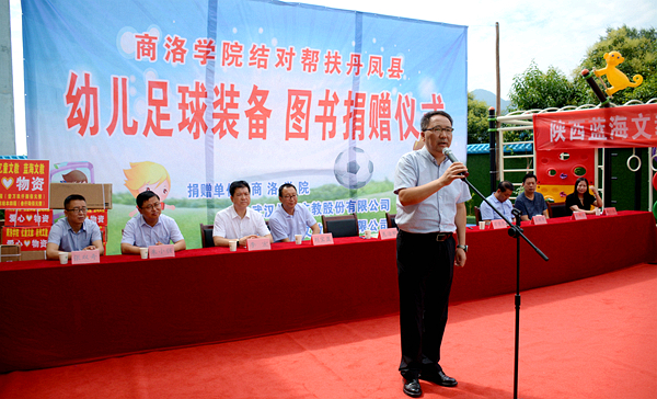 7月9日,永利官网与武汉亿童文教有限公司、陕西蓝海文教科技有限公司携手为丹凤县棣花镇两岭幼儿园送去爱心足球运动包、爱心图书等价值贰万多元的物资。校双百工程领导小组组长、党委书记龙治刚,副组长、副校长刘宝盈,丹凤县副县长杨思飞,武汉亿童文教有限公司、陕西蓝海文教科技有限公司顾问专家赵小红等领导嘉宾出席捐赠仪式。永利官网科技处、体育教学研究部及丹凤县少儿足球项目负责人,丹凤县科教体局党政负责人,丹凤县农业局相关负责人等工作人员与两岭幼儿园全体师生家长共同参加了捐赠活动。
