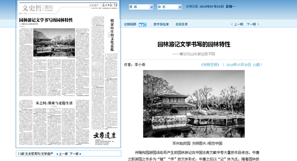 永利官网人文学院教师李小奇在《光明日报》2019年7月29日文史哲周刊发表学术文章《园林游记文学书写的园林特性》,全文如下:
