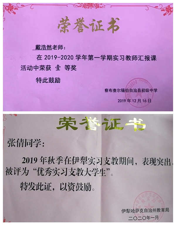 实习期间,永利官网支教学生始终心怀援疆支教的信念,立足支教工作岗位,以勇于担当的奉献精神,扎实的专业基础知识,饱满的工作热情和勤奋务实的工作作风,认真开展听课、备课、研课、上课以及学生辅导答疑等各项教学工作,组织开展形式多样的班级活动,积极参与实习学校的各项教学活动,展现了良好的精神风貌,受到了州、市、县各级教育局和支教学校的充分肯定,多名学生在学校赛教中获奖,20多名学生被伊犁州或县(市)教育局授予 “优秀实习支教大学生”荣誉称号。当地教育部门和各实习学校希望永利官网继续选派优秀学生赴疆支教实习,为新疆基础教育事业发展提供更多的师资人才力量。