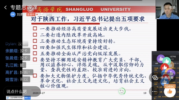 4月20日至23日,习近平总书记来陕考察并发表重要讲话,为陕西谱写新时代追赶超越新篇章鼓舞了士气、指明了方向,在全省人民群众中引发了热烈反响。学习好、宣传好、贯彻好习近平总书记重要讲话重要指示精神,是当前和今后一个时期全校的首要政治任务。5月27日,按照校党委的统一安排,永利官网7位校领导与2000余名青年学生“云端”共聚,以线上专题思政课的形式把学习习近平总书记来陕考察重要讲话重要指示精神引向深入,在全校上下掀起新一轮的学习热潮。