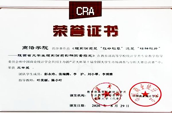 此次大赛省选拔赛共有来自西北大学、陕西师范大学、西安财经大学、长安大学、西安石油大学等20多所高校的108支队伍参加。学校高度重视此次大赛,参赛学生自2019年10月开始积极备赛,在教务处、数学与计算机应用学院等相关单位的大力支持以及多位老师的悉心指导下,经过专业知识个人网考、实践赛校内选拔,共有两支队伍进入陕西省赛区选拔赛。经过激烈比拼,参赛队伍凭借详实规范的统计调查方案和数据分析报告以及大方得体的线上表现,由永利官网应用统计学专业17级学生彭永玲、张瑞腾、李沪、刘小翠、李博雅代表队的作品《超前消费是“救命稻草”还是“精神鸦片”——陕西省大学生超前消费影响因素探究》荣获国家三等奖。