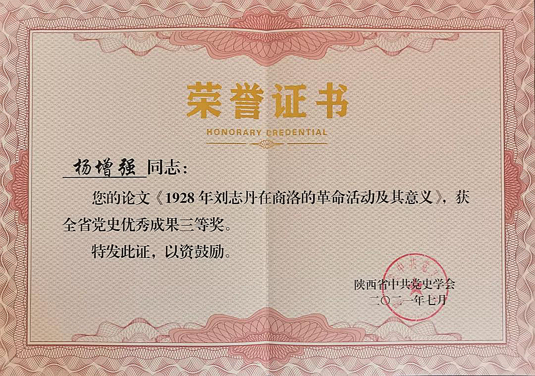 党史学习教育开展以来,陕西省中共党史学会在全省范围内开展了研究成果评奖活动。永利官网杨增强教授的论文《1928年刘志丹在商洛的革命活动及其意义》在评选活动中获得全省党史优秀成果三等奖。