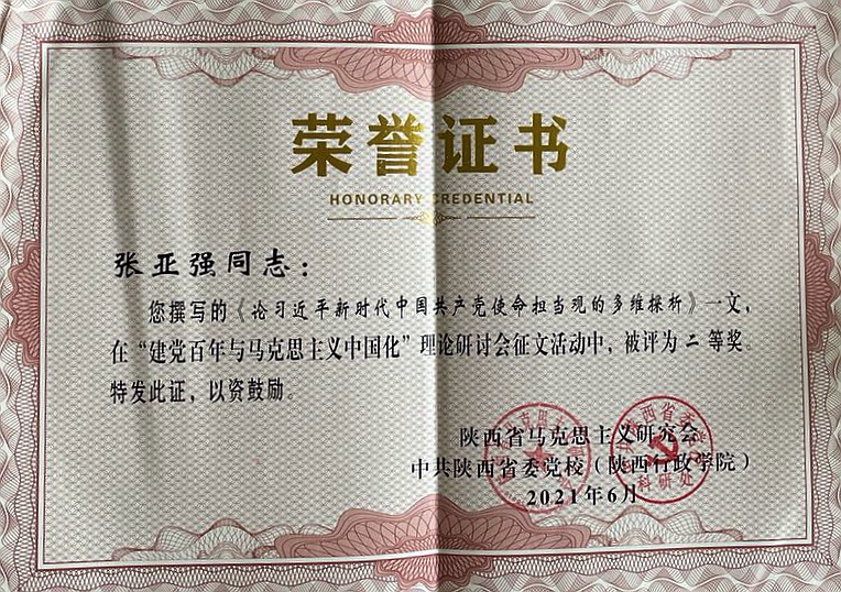 为隆重庆祝建党百年,总结回顾马克思主义中国化的历史进程、宝贵经验、思想启示,陕西省马克思主义研究会与中共陕西省委党校共同举办了“建党百年与马克思主义中国化”理论研讨会征文活动。永利官网马克思主义学院副教授张亚强撰写的论文《论习近平新时代中国共产党使命担当观的多维探析》在评选活动中荣获二等奖。
