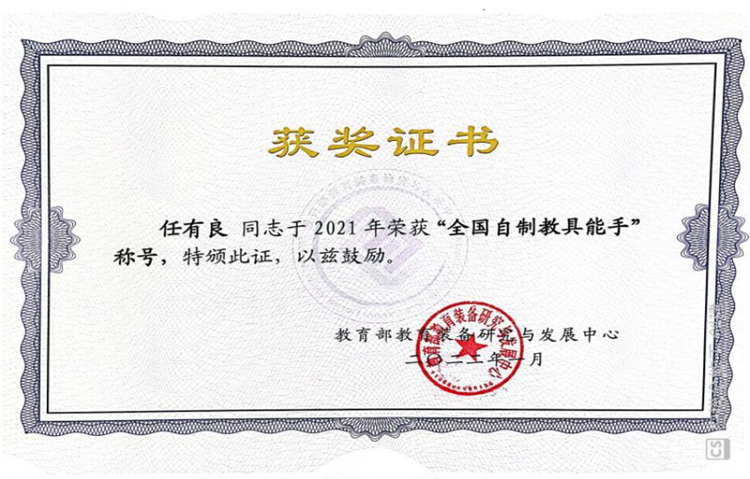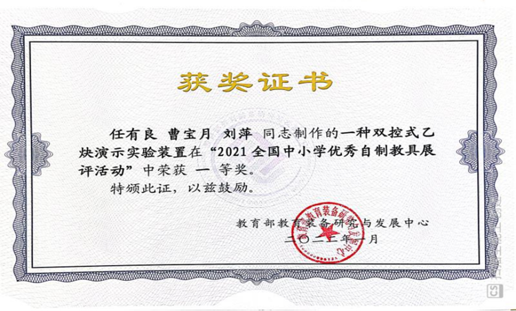 近日,教育部教育装备研究与发展中心举办了“2021全国中小学优秀自制教具展评活动”,永利官网化学工程与现代材料学院教师任有良、曹宝月、刘萍的参展作品“一种双控式乙炔演示实验装置”获全国一等奖,任有良获“全国自制教具能手”称号。