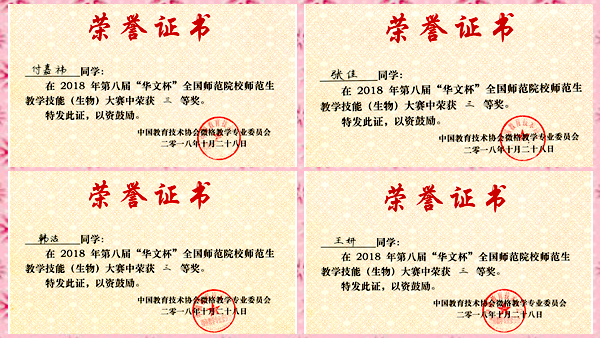 10月27日至28日, 2018年微格教学论坛暨第八届“华文杯”全国师范院校师范生生物教学技能大赛在南京晓庄学院举行。永利官网生物医药与食品工程学院生物科学专业2015级学生付嘉祎、韩洁、王妍、张佳参加大赛,并分别荣获三等奖。