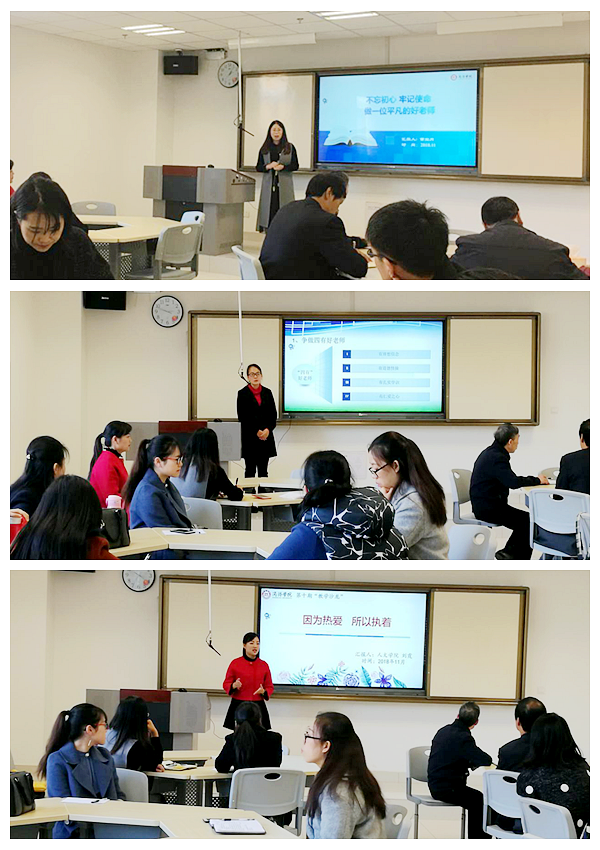 陕西省“课程思政”标兵曹宝月老师以“不忘初心,牢记使命,做一位平凡的好老师”为主题,从立德树人、教育创新,用心选择参赛课题,潜心设计教学方案,倾心完成教学过程四个方面分享了自己在课堂教学中的具体做法及参加教学大赛的实战经验;陕西高等学校青年教师教学竞赛一等奖获得者李亚文老师以“做‘四有’好老师,铸造有效课堂”为主题,从如何做“四有”好老师、怎样提高教学质量、参加教学竞赛的关键点三个方面交流了自己的心得体会;学校首届课堂教学创新大赛一等奖获得者刘霞老师以“因为热爱,所以执着”为主题,结合自己在教学中遇到的实际案例,从做走近学生的老师、做改革创新的老师、做坚持初心的老师三个方面讲述了自己在创新课堂教学方法、准备教学大赛中的经历和体悟。
