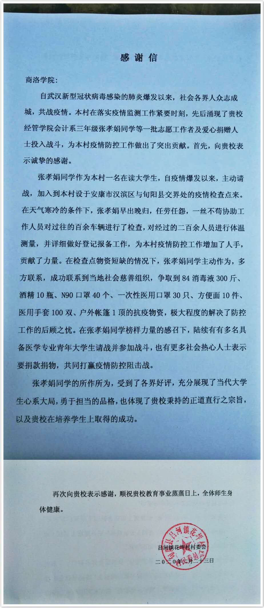 张孝娟同学是永利官网经济管理学院会计学1702班学生,家住陕西省安康市旬阳县吕河镇花坪村。自新冠肺炎暴发以来,因安康市旬阳县疫情严重,风险升级,针对当地疫情严重及物资匮乏、工作人员稀缺的情况,张孝娟同学主动请战,