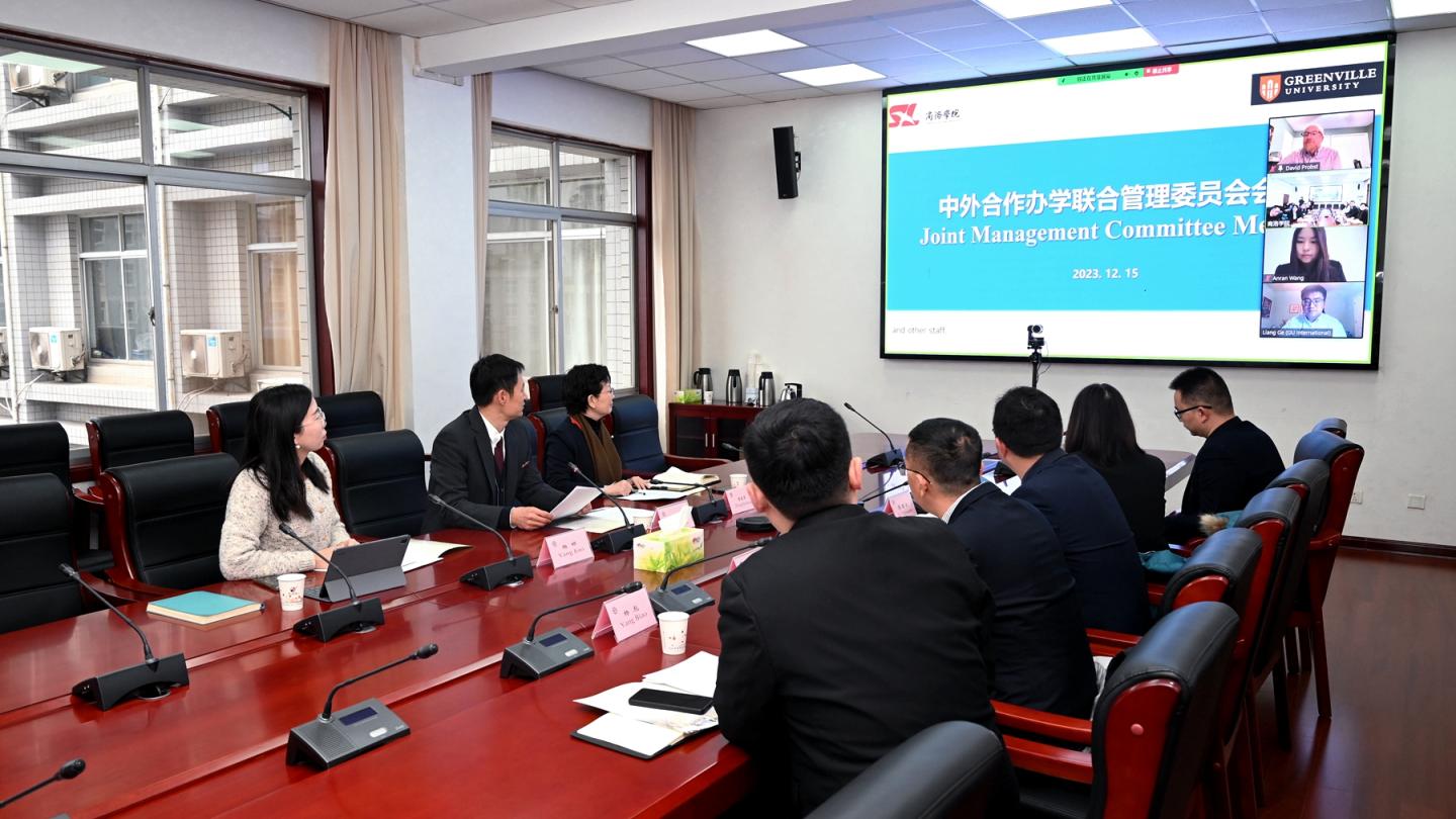 12月15日,永利官网召开中外合作办学联合管理委员会会议。校党委副书记刘勇出席会议。国际合作与交流处负责人,电信学院党政负责人及相关工作人员参加会议。美国格林威尔大学校长Suzanne Davis,工程系主任David Probst,国际处主任Liang Ge通过线上视频形式参加会议。