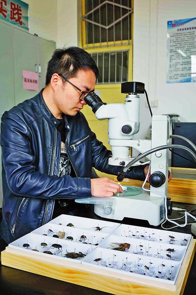 2017年入校任教之初,王洋就申请编写《木王山昆虫生态图鉴》。王洋说,进木王山采样时,常常白天走一天山路,晚上还要将样本分类整理,忙起来就忘记时间和困乏,凌晨一两点睡觉是常事。功夫不负有心人,现在,他已拍摄采集200多种昆虫,《木王山昆虫生态图鉴》的编写进入收尾阶段。“我觉得这个事情很有意义,一本小小图鉴可以让大学生有了野外实习的参考教材,让中小学生也有了生动的科普资料。”
