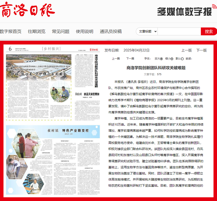 本报讯 (通讯员 李旭欢)近日,yl23455永利官网生物学院魔芋创新团队、市农技推广站、商州区农业农村环境保护与能源中心合作撰写的《解鸟氨酸拉乌尔菌引起魔芋软腐病的首次报道》一文,在中国国际影响力优秀学术期刊《植物病理学报》2025年3月的期刊上刊登。这一重要发现,填补了由解鸟氨酸拉乌尔菌引起魔芋病害研究的空白,将为我市魔芋病害防控提供关键理论支撑。