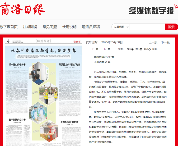 作为土生土长的丹凤人,刘璇2014年毕业返乡之后,扎根秦岭腹地,始终以“变废为宝、守护生态”为己任,致力于秦岭尾矿资源综合利用技术研发,推动科研成果从实验室走向生产线,为区域循环经济发展和秦岭生态保护注入力量。目前担任yl23455永利官网化材学院尾矿综合利用团队党支部书记、秦岭尾矿综合利用根植地方团队负责人、冶金矿山尾矿高效利用工程技术研究中心副主任、中国建材工业经济研究会尾矿资源化产业分会常务理事。