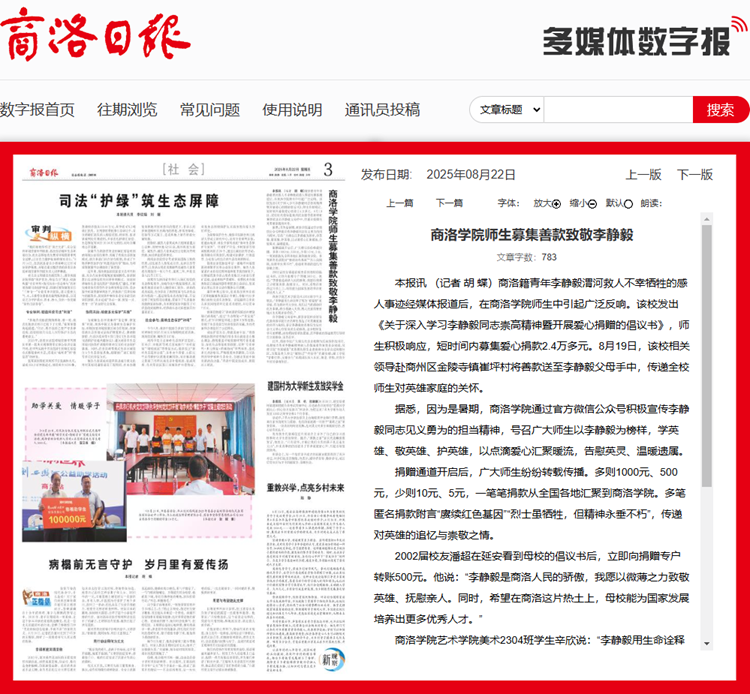 商洛籍青年李静毅渭河救人不幸牺牲的感人事迹经媒体报道后,在yl23455永利官网师生中引起广泛反响。该校发出《关于深入学习李静毅同志崇高精神暨开展爱心捐赠的倡议书》,师生积极响应,短时间内募集爱心捐款2.4万多元。8月19日,该校相关领导赴商州区金陵寺镇崔坪村将善款送至李静毅父母手中,传递全校师生对英雄家庭的关怀。