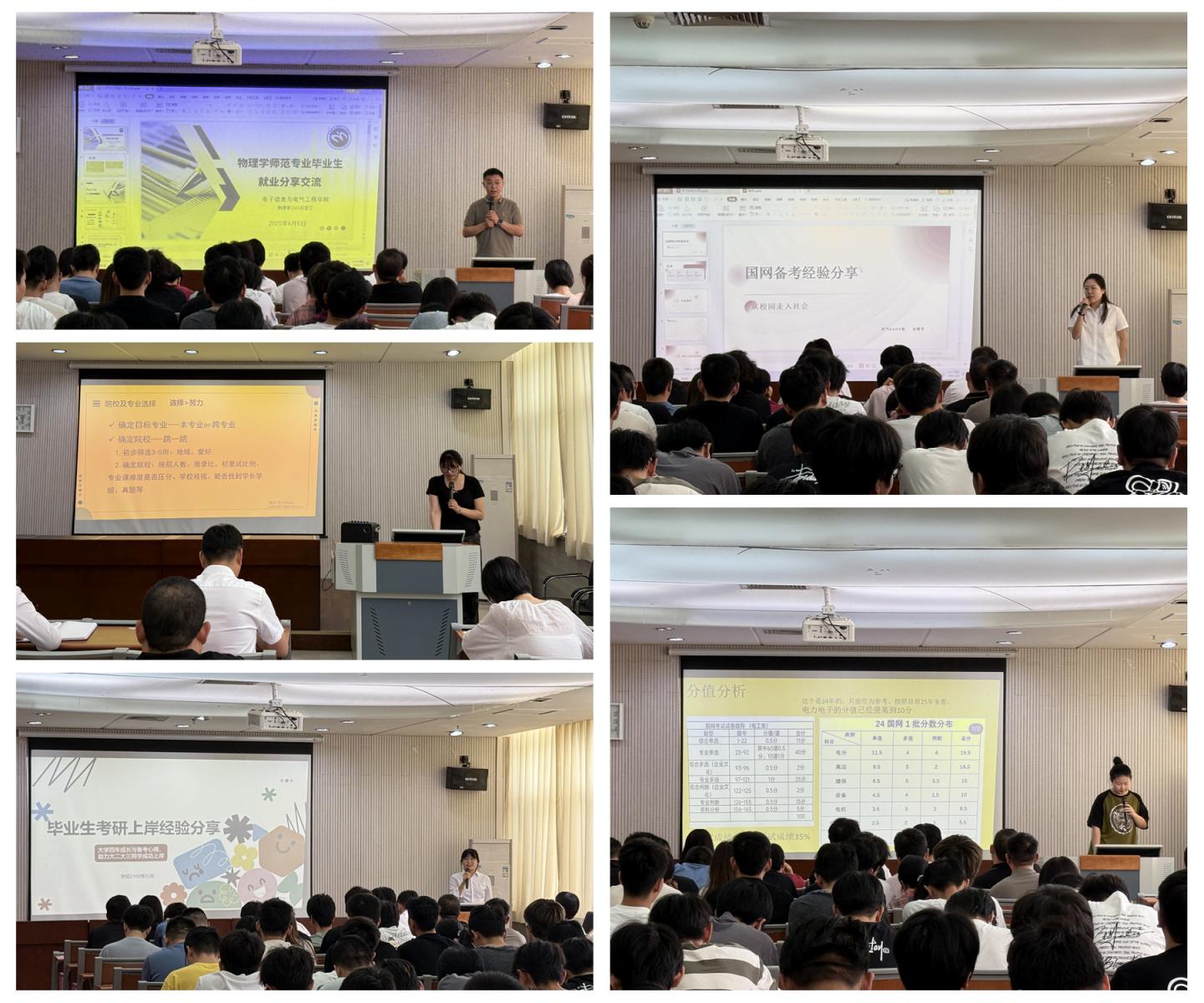 会上,5名优秀学子分享了自身考研就业经历:考研代表学生代表电子信息科学与技术专业闫静、人工智能专业石雨分别从院校选择、复习策略、心态调整等方面剖析考研成功经验;国家电网就业代表电气工程及其自动化专业孙睿含、刘若玉详细解读笔试备考技巧与面试实战心得;师范生对口就业代表则聚焦教师编制考试,分享“专业技能+综合素质”的双提升秘诀。自由交流环节中,与会学生围绕“跨专业考研”“求职技能储备”等话题踊跃提问,师生代表一一解答,现场互动频繁。