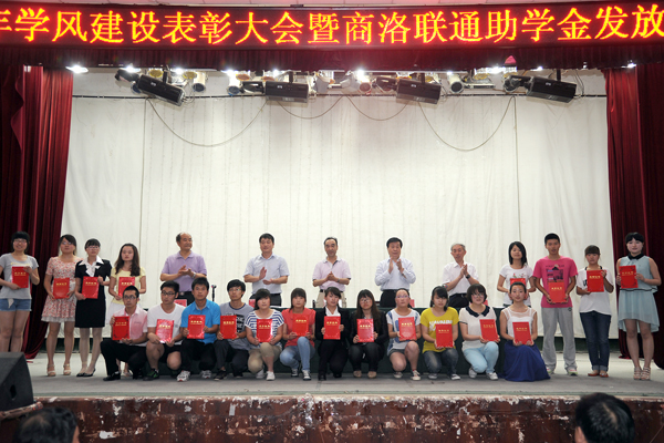 为了进一步推进学风建设和学生自主创业工作,营造良好的育人氛围,5月22日下午,永利官网隆重召开学风建设表彰大会,对2012年度国家奖学金、国家励志奖学金获奖学生进行表彰,对田亦柏等5名自主创业大学生进行奖励,对2012年学风建设先进集体进行表彰,同时为程时妍等20名2013年商洛联通助学金受助学生发放了助学金